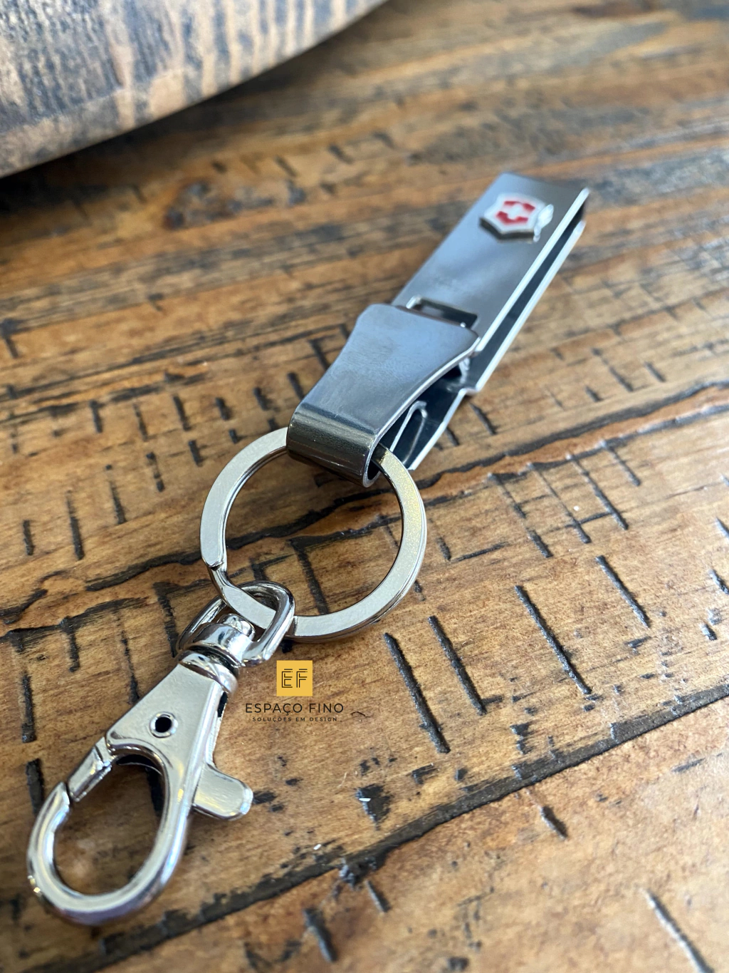 Chaveiro simples e muito prático para carregar seu canivete Victorinox! Possui sistema mosquetão para que fique seguro e junto ao corpo para quando precise utilizar.