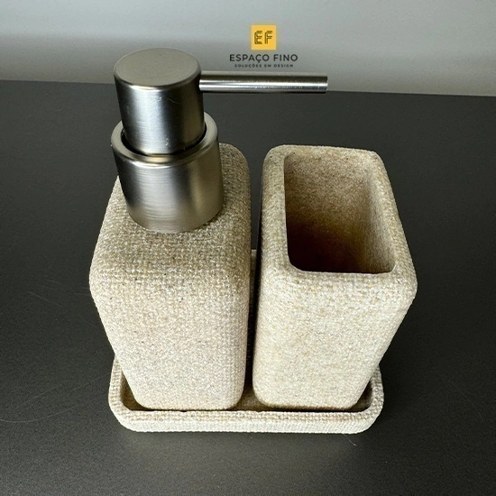 18407 - Kit de Banheiro Porta Sabonete líquido, Copo para Porta Escovas Sobre a Bandeja em Poliresina na cor Bege